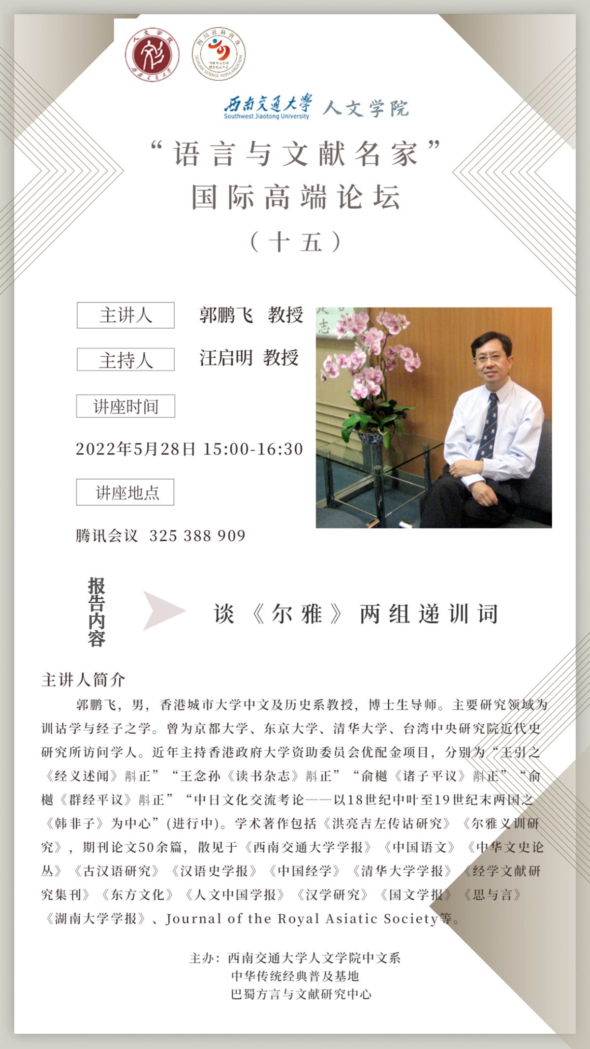 郭鹏飞,男,香港城市大学中文及历史系教授,博士生导师。主要研究领域为训诂学与经子之学。曾为京都大学、东京大学、清华大学、台湾中央研究院近代史研究所访问学人。近年主持香港特区政府大学资助委员会优配金项目,分别为“王引之《经义述闻》斠正”“王念孙《读书杂志》斠正”“俞樾《诸子平议》斠正”“俞樾《群经平议》斠正”“中日文化交流考论──以18世纪中叶至19世纪末两国之《韩非子》为中心”(进行中)。学术著作包括《洪亮吉左传诂研究》《尔雅义训研究》,期刊论文50余篇,散见于《色小说