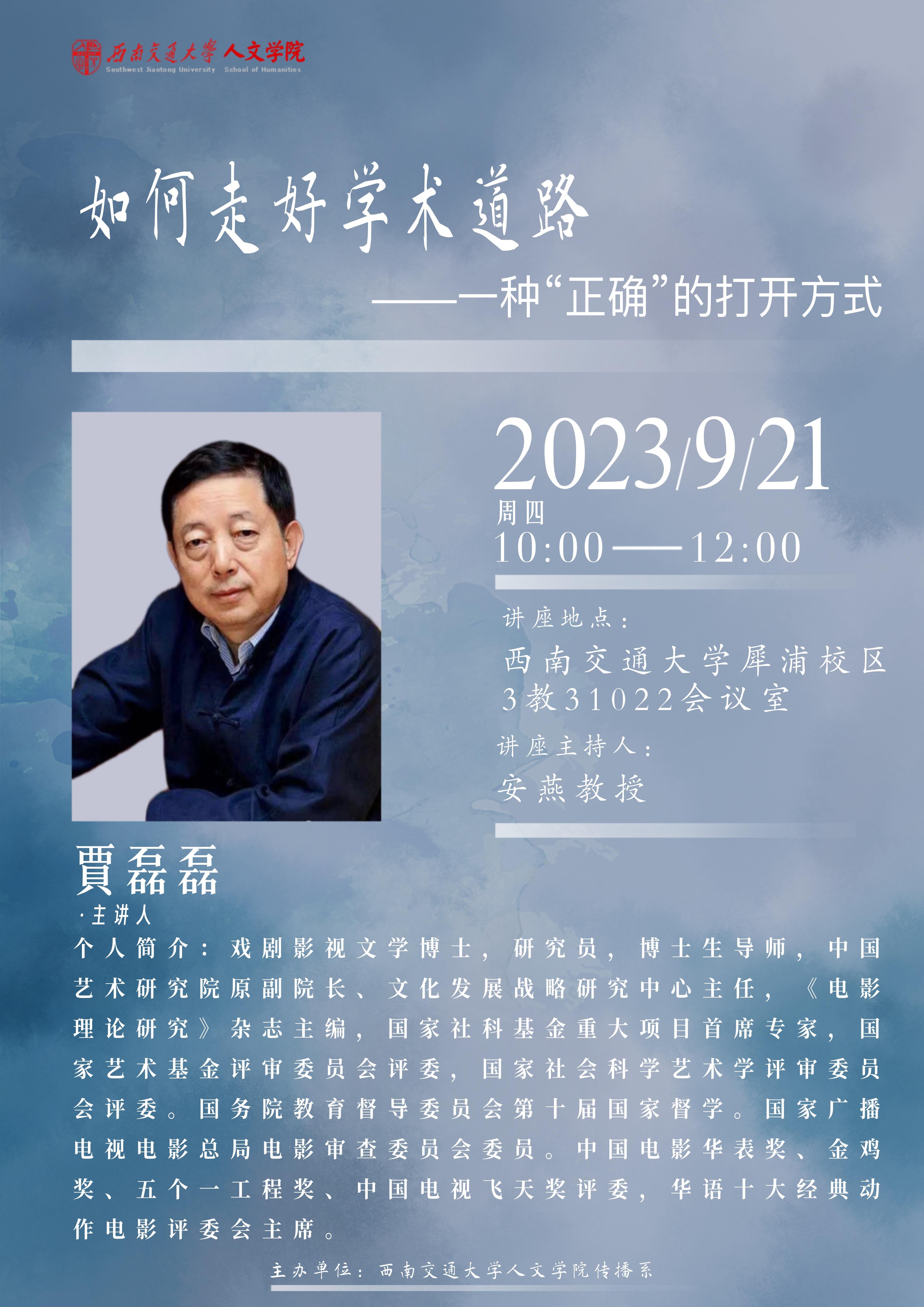 【主讲人简介】:贾磊磊,戏剧影视文学博士,研究员,博士生导师,中国艺术研究院原副院长、文化发展战略研究中心主任,《电影理论研究》杂志主编,国家社科基金重大项目首席专家,国家艺术基金评审委员会评委,国家社会科学艺术学评审委员会评委。国务院教育督导委员会第十届国家督学。国家广播电视电影总局电影审查委员会委员。中国电影华表奖、金鸡奖、五个一工程奖、中国电视飞天奖评委,华语十大经典动作电影评委会主席。