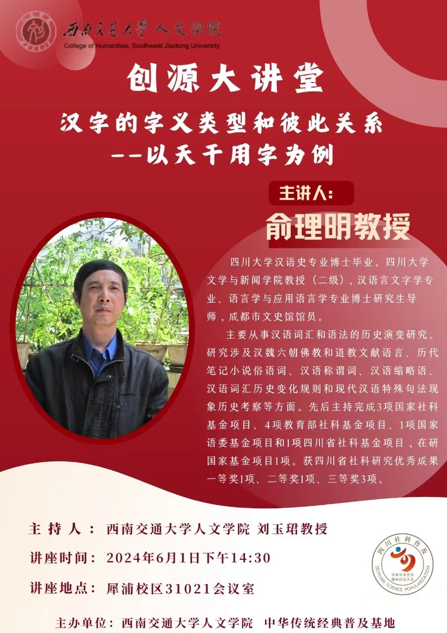 主讲人介绍:俞理明,四川大学汉语史专业博士毕业。四川大学文学与新闻学院教授(二级),汉语言文字学专业、语言学与应用语言学专业博士研究生导师,成都市文史馆馆员。主要从事汉语词汇和语法的历史演变研究。研究涉及汉魏六朝佛教和道教文献语言、历代笔记小说俗语词、汉语称谓词、汉语缩略语、汉语词汇历史变化规则和现代汉语特殊句法现象历史考察等方面。先后主持完成3项国家社科基金项目、4项教育部社科基金项目、1项国家语委基金项目和1项四川省社科基金项目,在研国家基金项目1项。获四川省社科研究优秀成果一等奖1项、二等奖1项、三等奖3项。