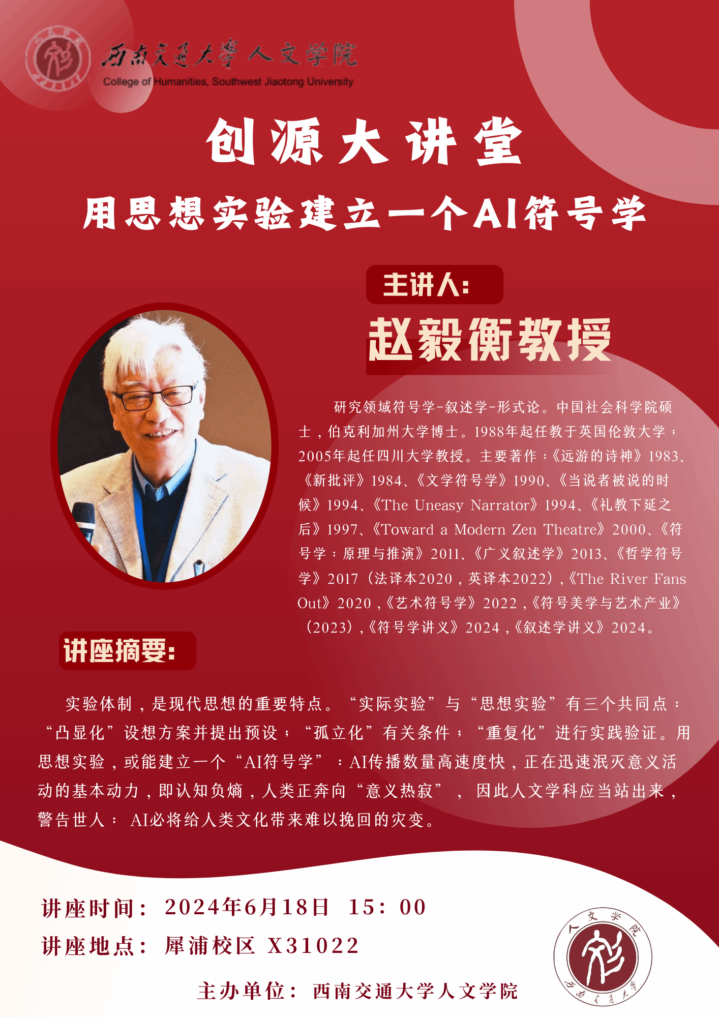 主讲人:赵毅衡(1943—),研究领域符号学-叙述学-形式论。中国社会科学院硕士,伯克利加州大学博士。1988年起任教于英国伦敦大学;2005年起任四川大学教授。主要著作:《远游的诗神》1983、《新批评》1984、《文学符号学》1990、《当说者被说的时候》1994、《The Uneasy Narrator》1994、《礼教下延之后》1997、《Toward a Modern Zen Theatre》2000、《符号学:原理与推演》2011、《广义叙述学》2013、《哲学符号学》2017(法译本2020,英译本2022),《The River Fans Out》2020,《艺术符号学》2022,《符号美学与艺术产业》(2023),《符号学讲义》2024,《叙述学讲义》2024。