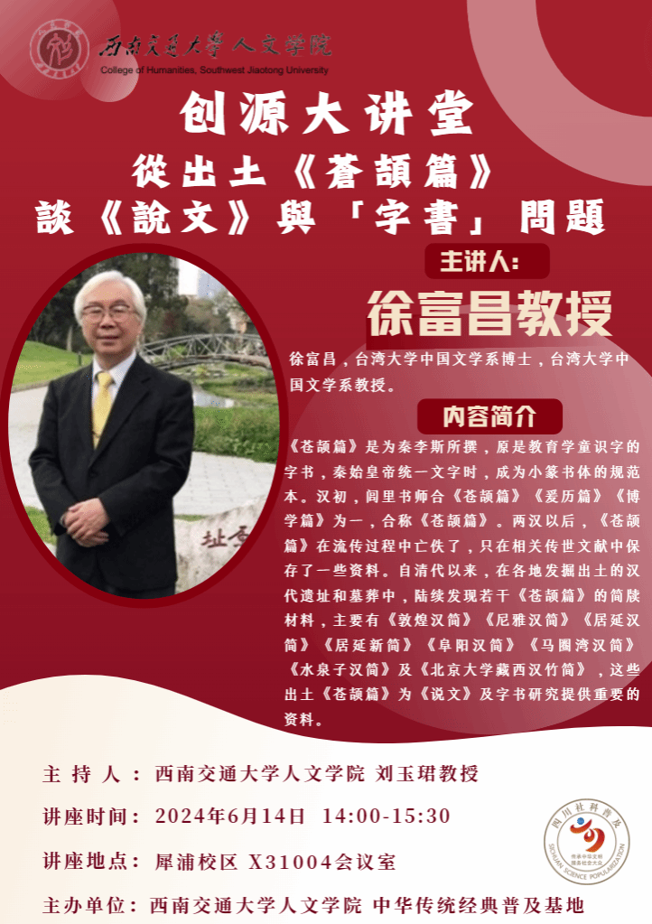 主讲人介绍:徐富昌,台湾大学中国文学系博士,台湾大学中国文学系教授。曾任台湾大学文学院副院长(十年)、语文中心主任、校长秘书及台大系统文化基金会董事、台湾中文学会理事、监事、中国文字学会常务理事、监事、中国训诂学会监事、中华简牍学会常务监事等职。曾任台湾大学校长遴选委员,负责遴选新任校长。又曾任北京师范大学文学院客座教授、南京大学人文社会科学高级研究院访问教授、山东大学国际汉学研究客座教授。专长为文字学、古文字学、出土文献、先秦两汉古籍、老庄学术、三国学术、武侠小说及对外汉语教学等,曾二度荣获台湾大学杰出教师奖。着有《汉简文字研究》《出土文献研究方法论文集》初集、《简帛典籍异文侧探》、《睡虎地秦简文字辞例新编》等书。