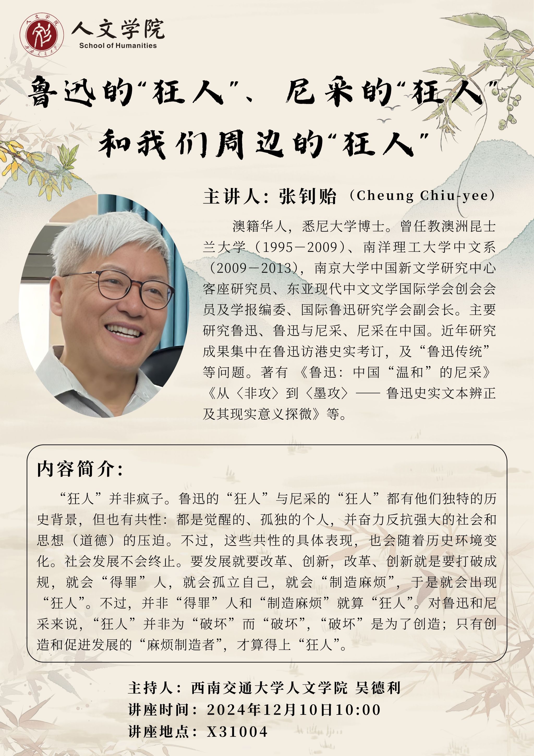 讲座题目:鲁迅的“狂人”、尼采的“狂人” 和我们周边的“狂人”