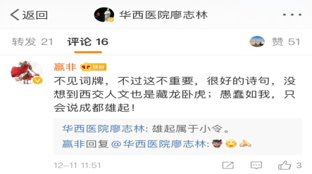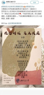 In the circle of friends of teachers and students of Southwest Jiaotong University, in the official microblog, in the microblog of "big V" of West China Hospital, and in the microblog of Liao Zhilin, director of the propaganda and United Front Work Department of the Party Committee, there are two impromptu poems "dedicated to the most beautiful rebel"