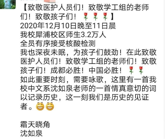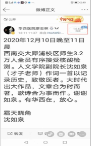 From the evening of December 10 to the morning of December 11, 2020, under the unified deployment of Chengdu Municipal Prevention and Control Office and the school, all staff of the College of Humanities carried out nucleic acid detection in an orderly manner. On this unforgettable night, the teachers and students were deeply moved to see the medical staff coming from all over the world to support them, taking fallen leaves as quilt and cold clothes as pillow, sticking to their posts and fighting all night. On this unforgettable night, the teachers and students of the College of Humanities also gathered their true feelings and cultural support with their own efforts and wrote every bit of the fight against the epidemic in poetry, music and video. As the teachers and students said, "this is not only a battle without gunpowder, but also the most vivid patriotic education!"
