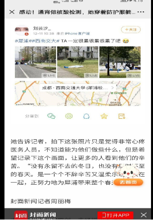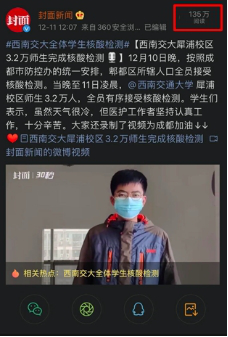 Just this morning when the nucleic acid test was completed, the "Cover News" app, the top ten most influential mainstream media in China, sent two video news in succession: "after the nucleic acid test was finished overnight, Southwest Jiaotong University students recorded videos to cheer for Chengdu" and "Southwest Jiaotong University finished the nucleic acid test overnight, and the students lined up in order." In the official microblog push of "Cover News", the number of the first video reading continued to rise, breaking through 1.4 million in less than three hours.