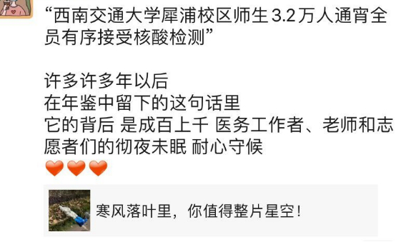 In the circle of friends and WeChat groups, more teachers and students shared the persistence of medical staff, the warmth of volunteers, the hard work of counselors, the order of the school, the strength of the organization, and all these have become the true feelings of Southwest Jiaotong University.