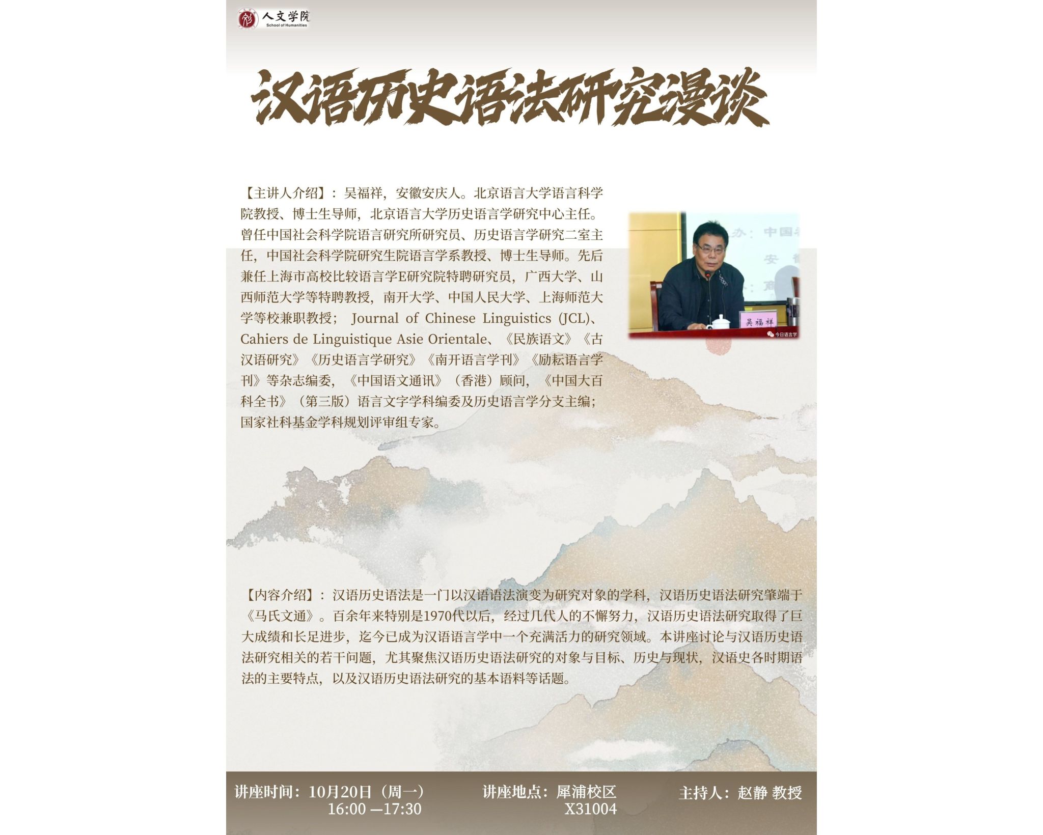 主讲人:北京语言大学语言科学院 吴福祥教授讲座时间:2025年10月20日(周一) 16:00-17:30讲座地点:犀浦校区X31004会议室主办单位:西南交通大学人文学院主持人:西南交通大学人文学院 赵静教授