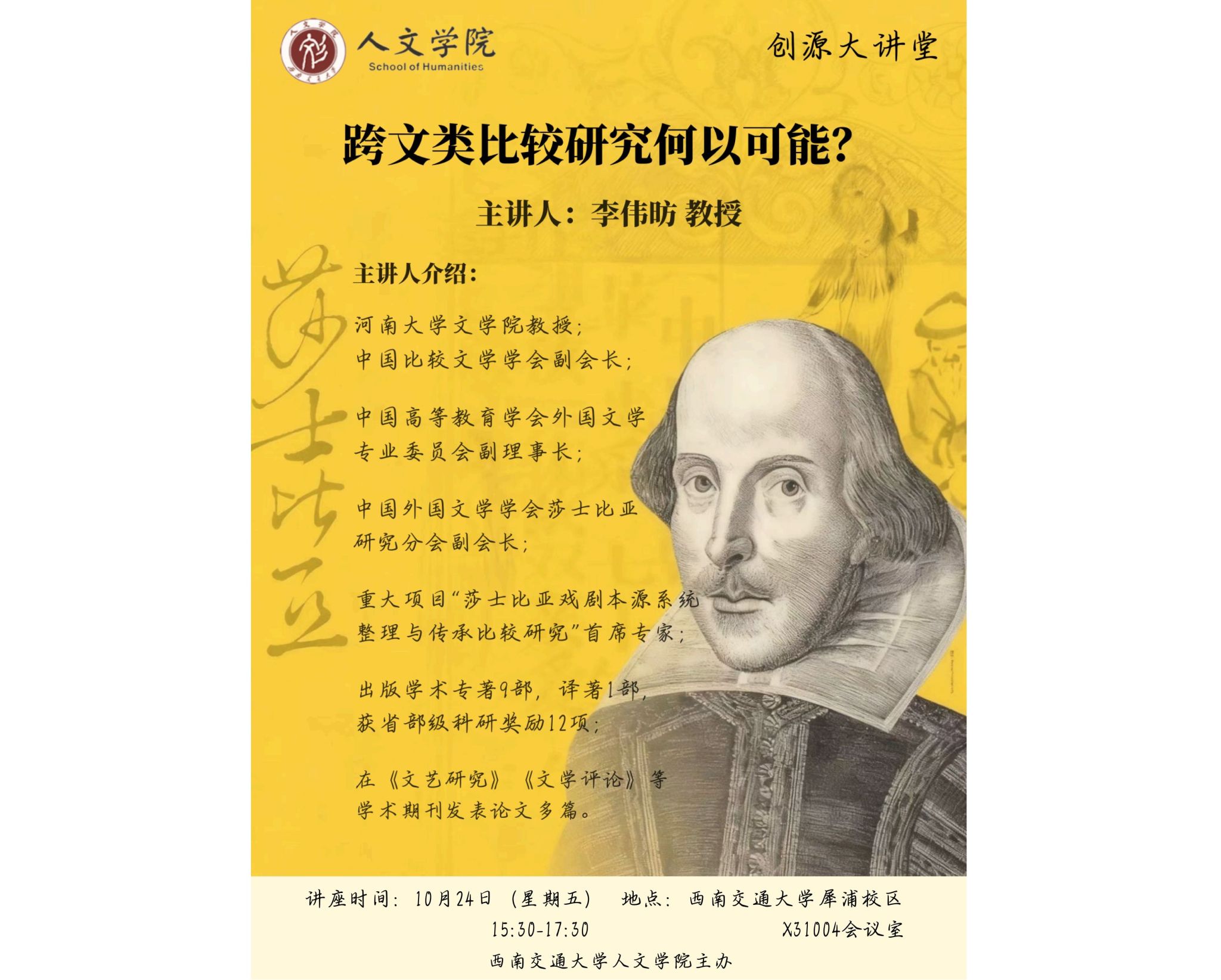 主讲:李伟昉 教授时间:2025年10月24日下午15:30-17:30地点:人文学院X31004会议室主讲人简介:河南大学文学院教授,河南大学中国语言文学博士点一级学科带头人,《河南大学学报》编辑部主任、主编。全国优秀博士学位论文奖获得者,教育部中文教学指导委员会委员,国家教材委员会学科专家组成员,国家社科基金评审专家,剑桥大学、哈佛大学访问学者,中国比较文学学会副会长,中国外国文学学会莎士比亚研究分会副会长,中国高等教育学会外国文学专业委员会副理事长,...