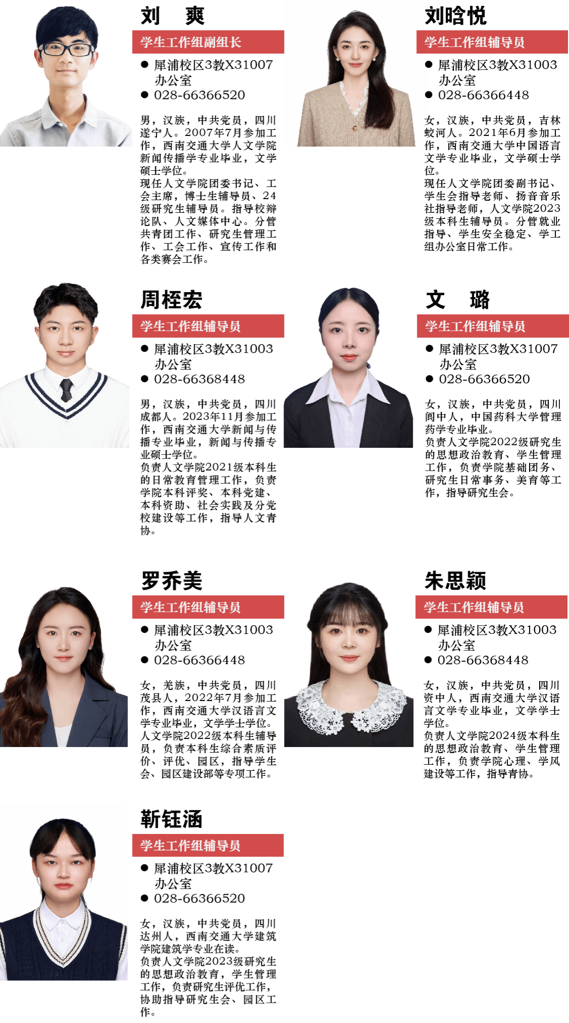 人文学生工作组坚持以立德树人为根本任务,以党建为龙头、坚持五育并举、打造网络思政阵地、夯实学风建设、精细宿舍管理、精准资助育人、不断压实压牢安稳工作、抓好学工队伍建设,全面加强学生思想政治教育工作,引导学生成长为能够担当民族复兴大任的时代新人。