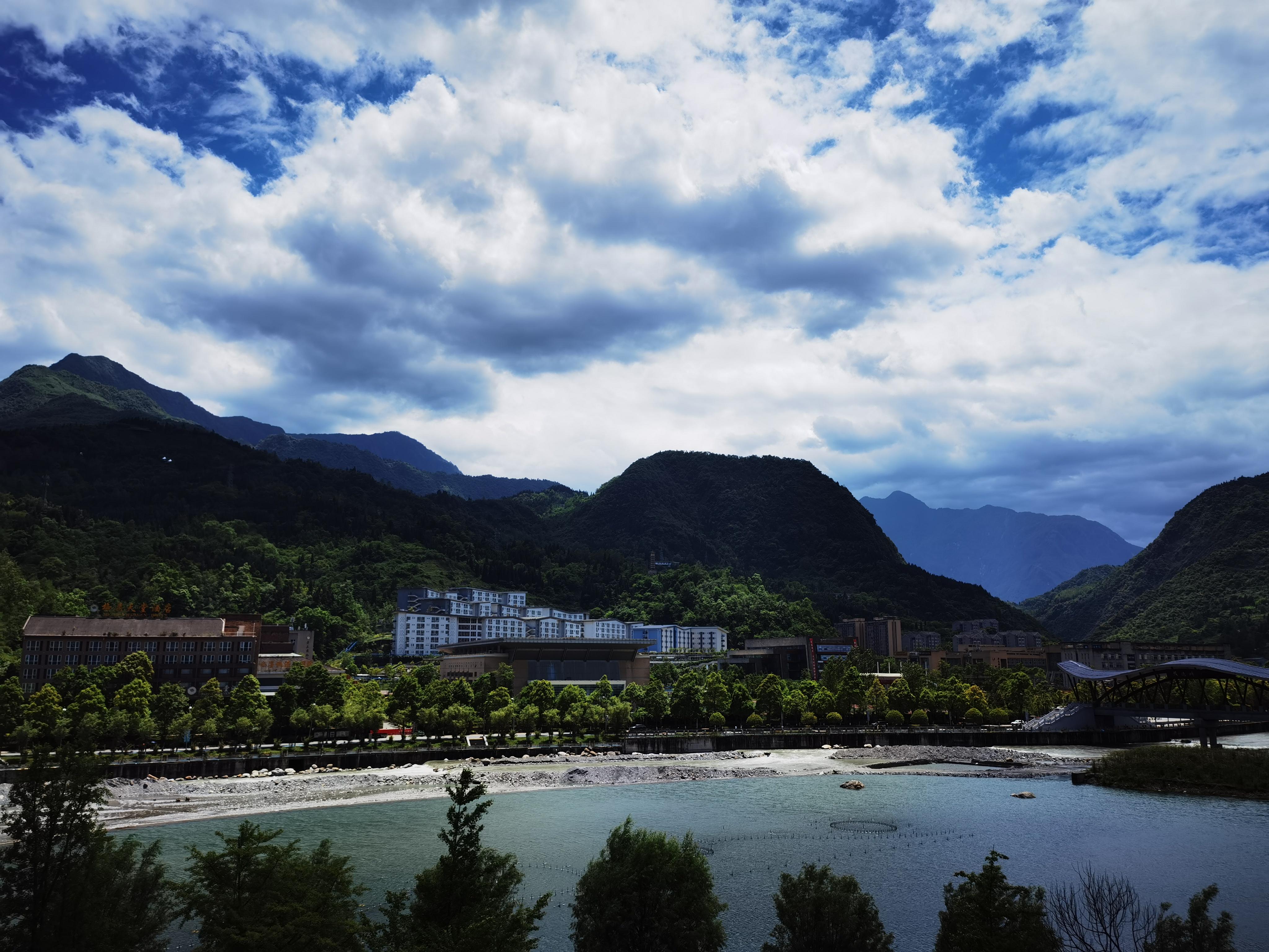 在水磨镇,支部来到了2008年汶川特大地震后整体异地重建的阿坝师范学院进行考察。青山绿水环抱着这所灾后重建的新校园,明亮的阳光洒在学子们微笑的脸庞。校外连绵的一片新居,是由广东佛山援建的水墨古镇,校门口的道路正是以援建单位命名的佛山大道。